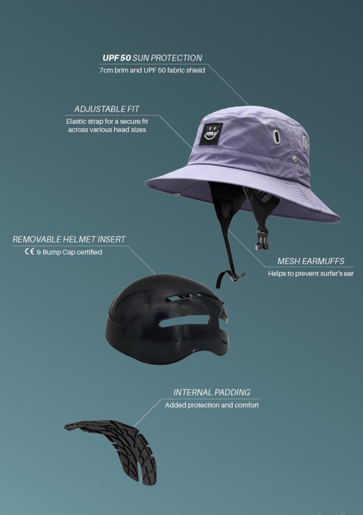 Integrated Protection: Enhanced safety through our protective insert securing most of your head from unexpected low to medium impacts during the day-to-day surf. Removable for flexible wear.